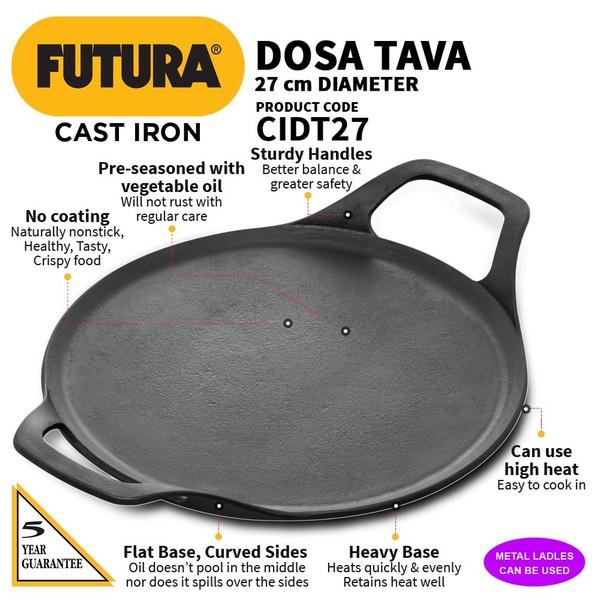 Futura Cast Iron Dosa Tava or Skillet deserves a place in your kitchen: Naturally Nonstick, Healthy, Tasty, Crispy Food - Our cast iron tava / skillet naturally develops a nonstick surface, ensuring your meals are not only delicious but also prepared with minimal oil for a healthier option that doesn't compromise on taste and crispiness. Can Use High Heat - Retains Heat Well - The cast iron material retains and distributes heat evenly, making it a breeze to achieve perfect sears, roasts, and bakes. Rough and Tough - Can Use Metal Ladles - Our dosa tava is rough and tough. You can confidently use metal ladles without worrying about damaging the surface, ensuring longevity and resilience. Pre-Seasoned with Vegetable Oil - Rust-Free with Regular Care - Our cast iron dosa tava comes pre-seasoned with vegetable oil, providing a protective layer that, with regular care, ensures your skillet remains rust-free and ready for action. Extra-Thick 5 mm Base - Food Will Not Burn or Stick - Cook with confidence knowing that the extra-thick 5 mm base prevents burning and sticking. Enjoy evenly cooked meals every time, whether you're searing, frying, or baking. Iron is Widely Regarded as Beneficial for Cooking - adding a subtle nutritional boost to your favorite dishes. Cast Iron is Versatile - Use on Gas, in Oven, on Grill, or Chulha - Our cast iron skillet is incredibly versatile, allowing you to use it on gas stovetops, in the oven, on the grill, or even traditional chulhas.