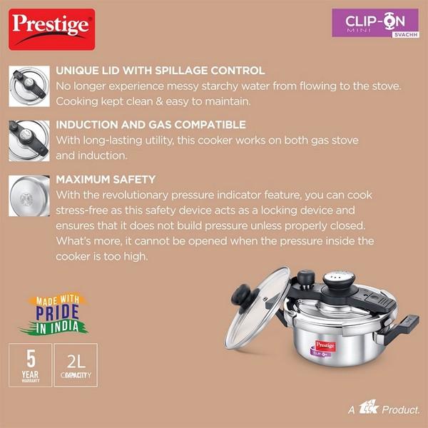 The Prestige Clip-On Svachh pressure cooker range is modular in design, which means you can use the same lid on all utensils in the range.