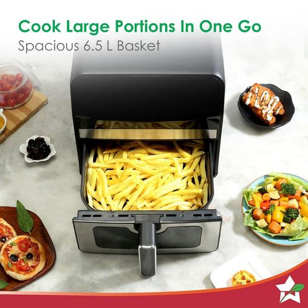 Cook healthy and crispy snacks with almost no oil. 7 Pre-set functions including baking, grilling, frying, roasting. Window and interior lights to help you monitor. Comes with digital display for precise temperature and time adjustments. Built-in memory to resume cooking if stopped in-between. 1450W | 5.0L.