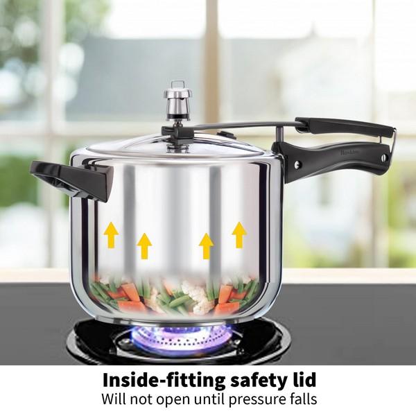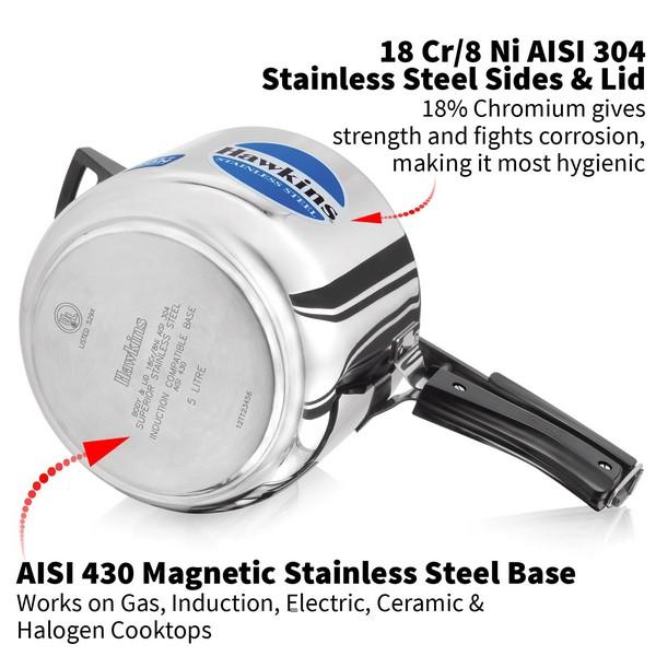 The pressure cooker body and lid are made of food-grade, superior stainless steel for maximum hygiene and durability. On the outside bottom of the pressure cooker, sandwiched between two sheets of stainless steel, The unique Hawkins pressure-locked safety lid ensures that when there is pressure inside the cooker, the lid is pressure-locked like a modern jetliner door. It cannot be opened until the pressure has fallen to a safe level.