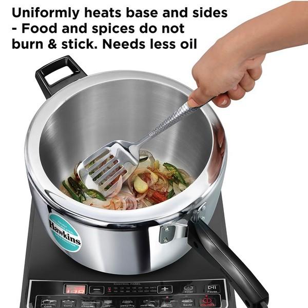 - 3 mm Extra-Thick Triply Stainless Steel - Uniformly heats base and sides - Food and spices do not burn & stick. Needs less oil