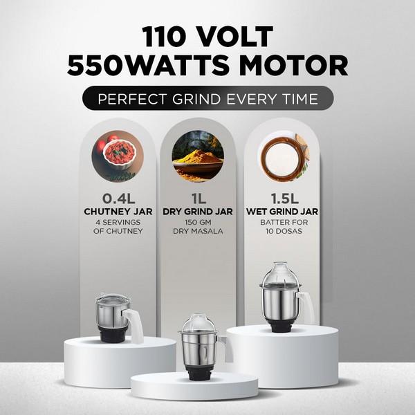 Package Contents: Mixer Grinder, 1.5-Litre stainless steel jar with blade, polycarbonate dome and handle, 1-Litre stainless steel jar with blade, polycarbonate dome and handle and 0.4-Litre stainless steel chutney grinder with blade, polycarbonate dome and handle, stirrer and Instruction Manual