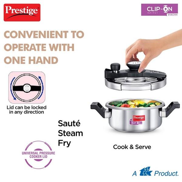 Use the unique glass lid to saute, steam, fry, boil, cook and even serve. The Prestige Clip-on Mini Svachh Pressure cooker range is modular in design, which means you can use the same lid on all utensils in the range.
