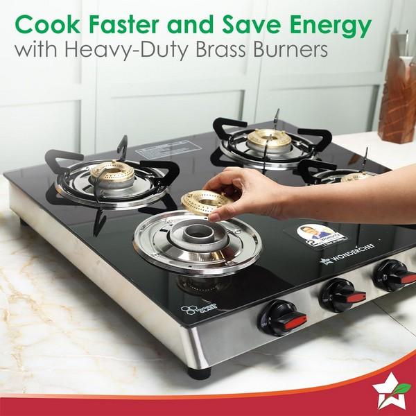 LARGE TRI-PIN BRASS BURNERS: The burners are made of high-quality brass, and designed with a tri-pin configuration, offering efficient heat distribution and uniform cooking.