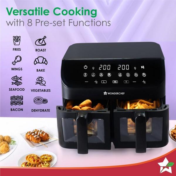 Cook healthy and crispy snacks with almost no oil. Simultaneously cook 2 different dishes in 2 separate baskets and 2 different ways. 8 Pre-set functions including baking, grilling, frying, roasting. Window and interior lights to help you monitor the cooking. Comes with digital display and 2 independent touch controls. 2000W | 9L